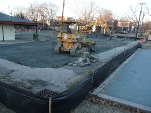 Day 3 – February 16. The plaza/petanque court area is moving ahead with spreading of 7 inches of stone dust.